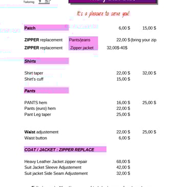 Discover the price list for the various alterations carried out
